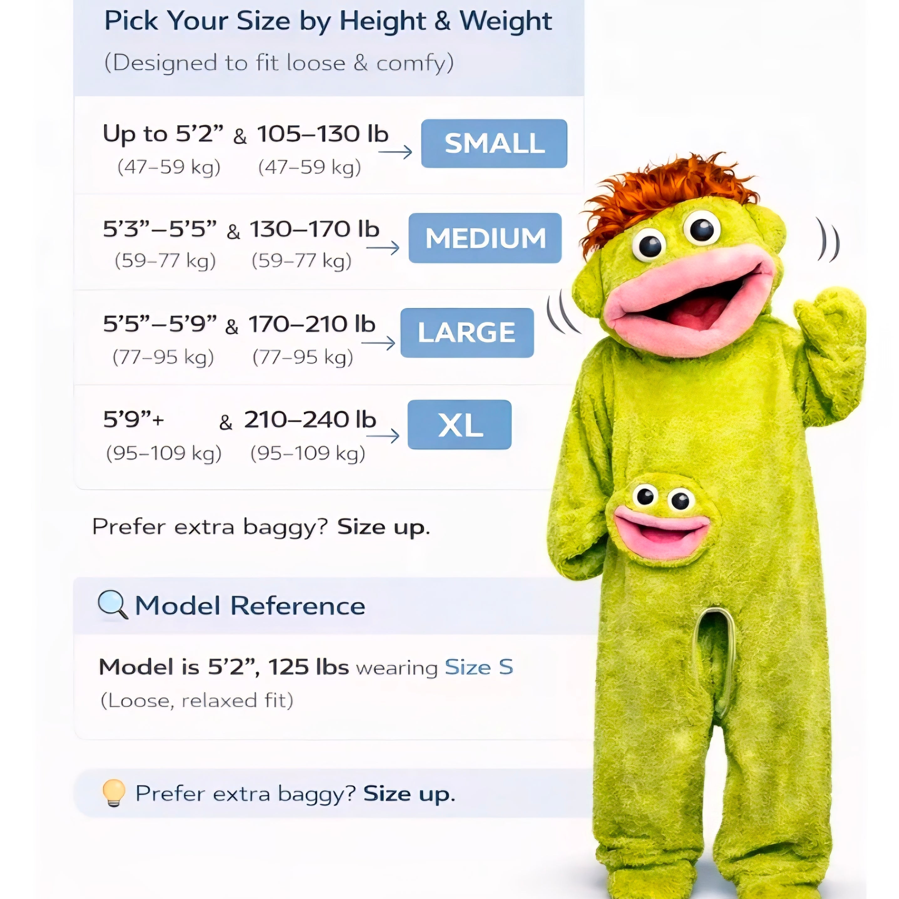 Designed with a large oversized smile and exaggerated cartoon features, this onesie instantly transforms you into the life of the party. The expressive face and roomy fit create a lovable, larger-than-life look that’s impossible to ignore.